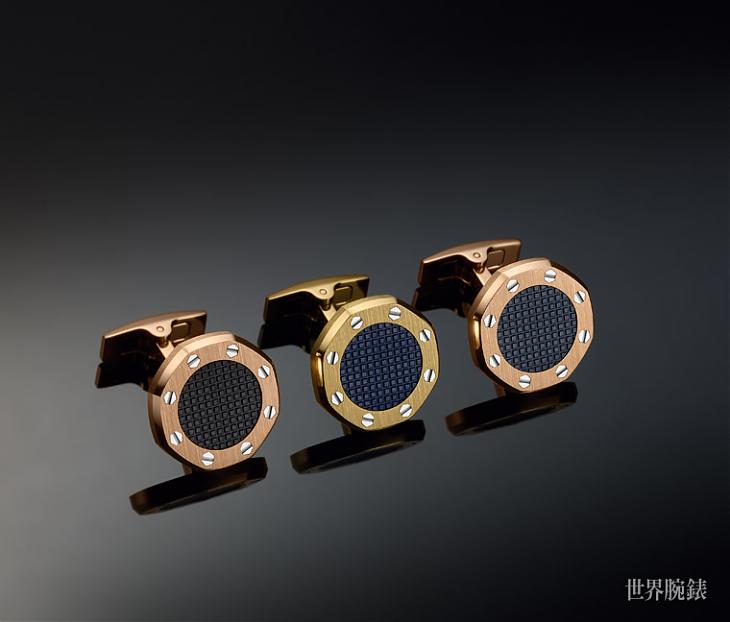 另外为了配搭全新皇家橡树系列霜金41毫米腕表,爱彼推出六款全新皇家橡树袖扣:叁款为不锈钢材质,中央缀有蓝、黑或银色"Tapisserie"格纹装饰图案;两款为玫瑰金材质,中央缀有蓝或黑色"Tapisserie"格纹装饰图案;最后一款是黄金材质,中央缀有蓝色"Tapisserie"格纹装饰图案。这些袖扣亦具备皇家橡树表壳的两项标誌性特点:着名的八角造型&六角形螺丝。