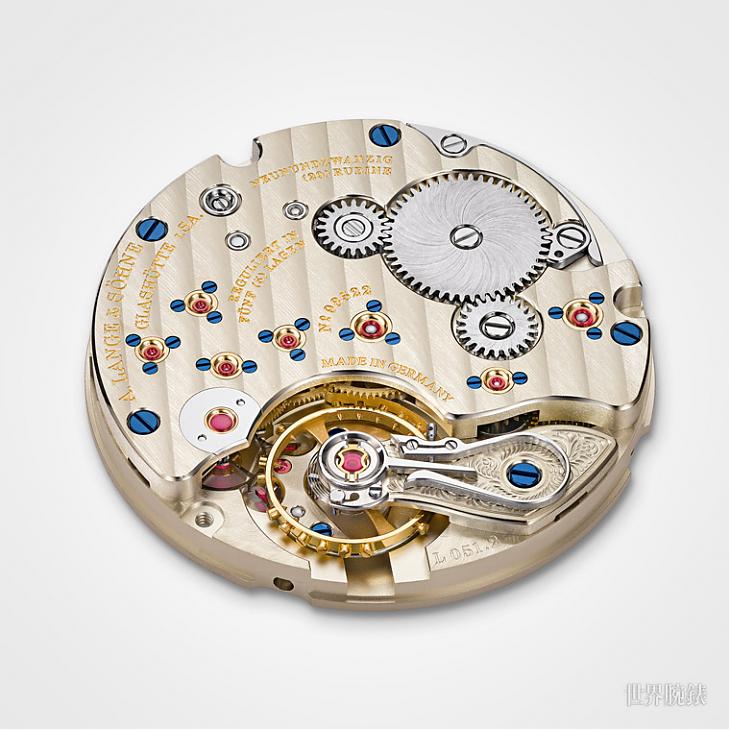 ▲机芯呈现多项朗格技艺特点,包括经倒角和拋光的边位、饰以格拉苏蒂螺纹的3/4夹板、由蓝钢螺丝固定的黄金套筒、经拋光的擒纵轮夹板尾端件,以及夹板上的上鍊齿轮。