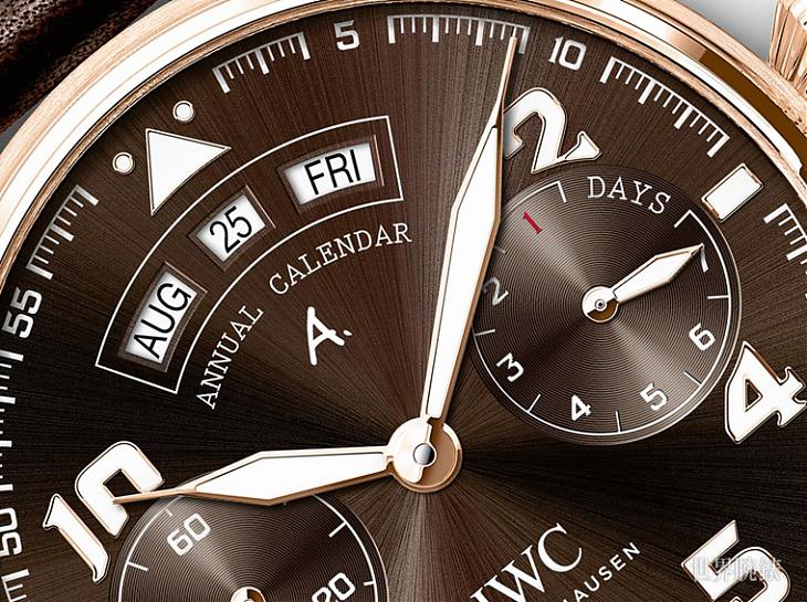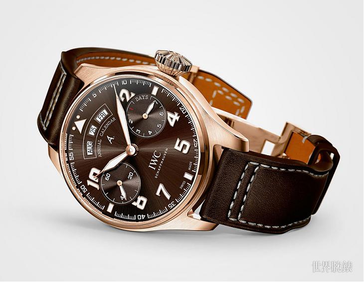 与小王子年历特别版相同的是,大型飞行员年历腕表「圣艾修伯里」特别版也是这个子系列线上唯一的玫瑰金款式,而两个特别版最主要的差别还是在于面盘的设计。圣艾修伯里特别版清一色都是採用烟草棕色面盘(小王子特别版则习惯用清爽蓝面),而这次採用的玫瑰金表壳与棕色面盘的组合新鲜之餘因为同属暖色系,看起来也相当合拍。比起小王子特别版,圣艾修伯里特别版在年历视窗下方还多了一个代表性的”A”字样,使其看起来多了点特殊性。