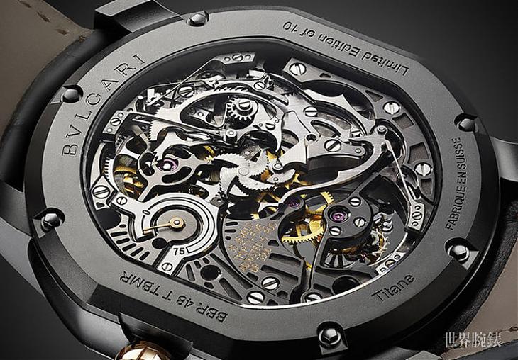 Daniel Roth Tourbillon Carillon是宝格丽高阶复杂工艺的最佳代表之一,也是其多年潜心钻研的成果,它不仅代表一项挑战的成功——征服在制表技术中最艰深、最考功夫的叁问报时;更明示了BVLGARI要在细节中彰显身价的巧思。先前品牌曾经推出过贵金属版本来呼应叁问功能在制表领域的珍罕价值,不过话说回来,如果要从实质层面考量,显然打造问表的表壳材质还有更适合的选择,一般来说材质愈轻且坚硬的话,所能表现的传声效果也会愈好,所以近几年可以发现有些高级表厂的问表开始重质胜于高贵度,纷纷选择鈦金属材质制作问表,对于问表制作经验丰富的宝格丽来说当然不会不知道使用鈦金属的优点,于是便催生了新版的Tourbillon Carillon鐘乐叁问报时陀飞轮。