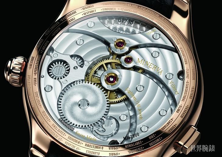 ▲翻至表背,可见玫瑰金表壳边缘上鐫刻有按时区顺序分佈的北半球24座主要城市,以及南半球20多个主要城市的名称;机芯夹板更有从01/18到18/18的限量序号。
