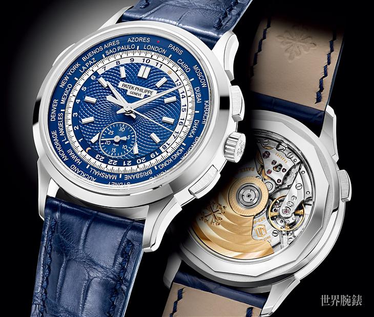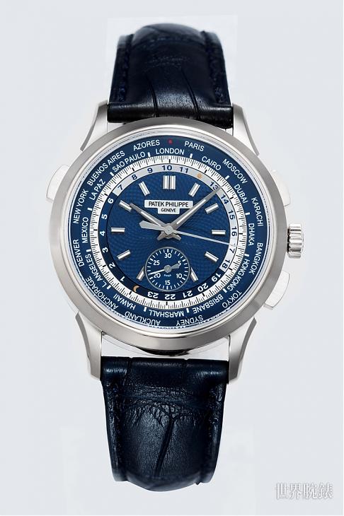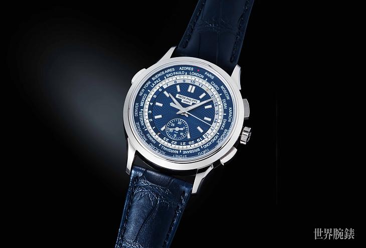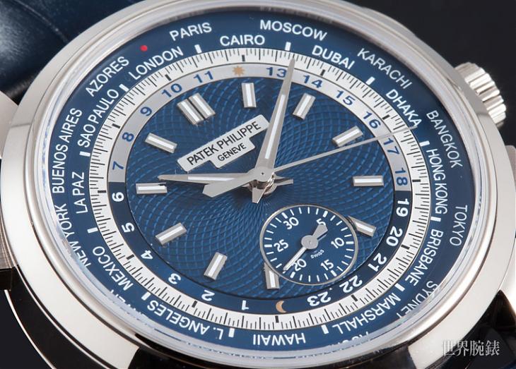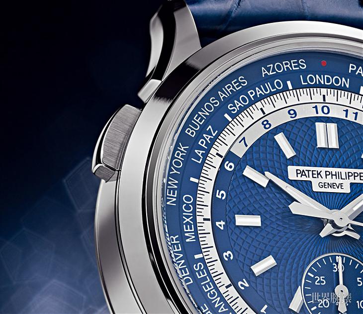▲这款是百达翡丽近代第一只配有计时功能的世界时区表,以CH 28-520机芯加载世界时区模组,但将60分鐘计时盘精简为30分鐘并将轴心略上移以缩小盘面,蓝色的手工雕饰面盘同时兼有放射纹与扭索纹的特色。