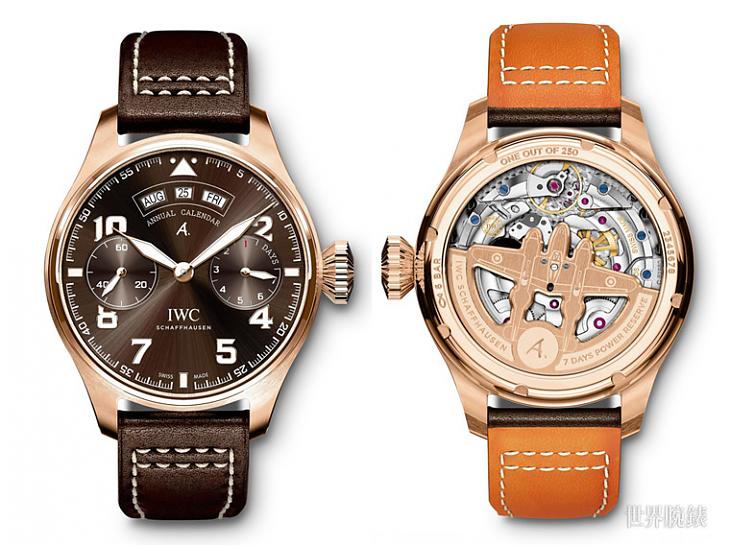 大型飞行员年历腕表「安东尼.圣艾修伯里」特别版限量250只:18K红金表壳,搭配棕色面盘与镀金指针,并饰有奶油色缝线的棕色小牛皮表带,让人联想起圣艾修伯里当年所穿的飞行服的顏色。年历在叁个独立视窗中分别显示月份、日期以及星期,只需每年二月底手动调校一次。IWC 52850自制机芯运用了由陶瓷材料制作而成的零部件,近乎无磨损,并以双发条盒实现了七天之久的动力储备功能。这款腕表的一个亮点在于P-38闪电式战斗机造型的18K纯红金自动盘——安东尼.圣艾修伯里正是驾驶这款飞机于1944年在地中海上空执行侦察任务,就此失踪,再也没有回来。这款腕表是此特别版系列中的全新表款,IWC以此彰显与安东尼.圣艾修伯里基金会的长期合作伙伴关系。