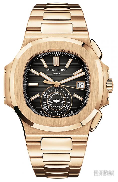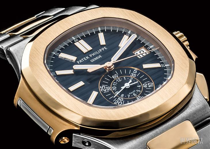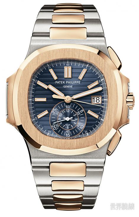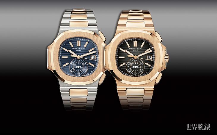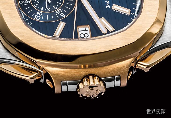 Nautilus在初发表时,品牌虽以耐用的不锈钢材质打造强悍实用的形象,但针对追求更加尊贵格调的藏家,2013年品牌推出这两款尤其能满足喜好,真正符合「最高级的运动表」的定位。Ref. 5980/1R-001玫瑰金材质表壳搭配黑色面盘,对比的高贵配色加上Gradient横条饰纹,气质稳重之餘又有活泼变化;至于Ref. 5980/1AR-001则是该系列首只兼用不锈钢与玫瑰金材质的款式,全表以不锈钢为主,但针对门面的表圈、表冠护肩以及计时按把,则使用相对华丽的玫瑰金,连不锈钢鍊带也在中间的鍊节穿插玫瑰金,加上湛蓝色面盘,华丽与耐用兼备,呈现愈发活泼、年轻化的设计。
