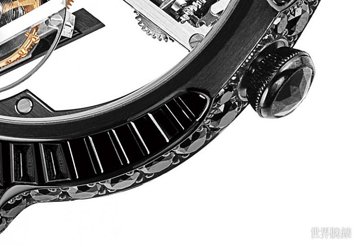 ▲呼应路易威登全新Conquêtes高级珠宝系列和展出,路易威登特别打造了镶有罕见的黑钻特别表款,细节可见精湛的切割工艺。