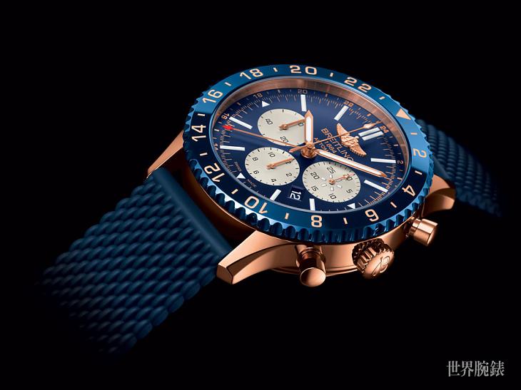 ▲Chronoliner B04推出贵金属版本的限量款,搭配蓝色陶瓷表圈以及蓝色面盘,在优雅的动感中另添一分贵气感。