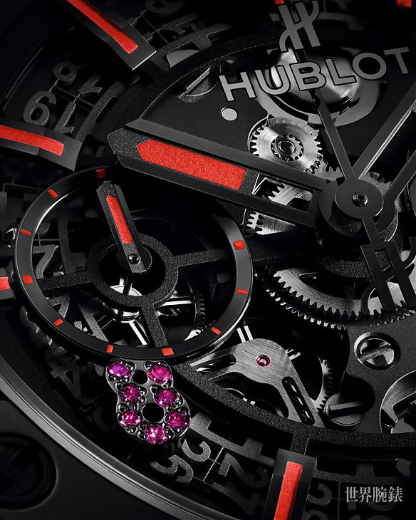 全新Big Bang Unico WPT限量腕表,保留标誌性的Big Bang系列特徵,45毫米直径表壳以微喷砂陶瓷材质打造,巧妙地将扑克元素融入设计,于表圈上装饰标誌性的红心、黑桃、梅花、方块图案。分鐘计时盘位于叁点鐘位置,小秒盘则位于九点鐘位置。日期窗格则同样在叁点鐘位置,面盘8点鐘以数颗红宝石特别装饰,表现数字8在亚洲文化中象徵的财富和幸运。