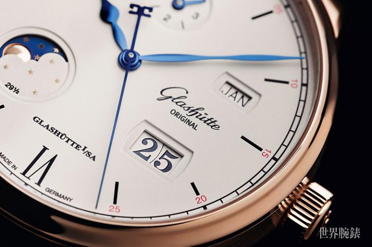 表款清爽俐落的面盘佈局乍看可能还无法意会它是万年历等级的复杂功能款,关键在于品牌化繁为简地使用视窗取代指针设计。质感温润的米白色面盘含有细腻霜状纹理,配合黑色罗马数字时标,格拉苏蒂原创常採用的蓝钢指针跃然其上,位于中央的独特皇冠双G秒针更是点睛之笔,整体古典意味浓厚,呈现出优雅柔和的氛围;而防反光蓝宝石水晶镜面的使用,除了更方便读时,也令表款更显内敛凝聚之美。