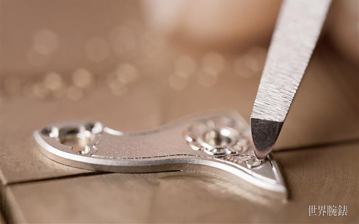 最能体现时计精美绝伦的莫过于内敛出色的细节。这也是收藏家欣赏表款的第一步:观察表桥和槓桿的内角。如果其棱角分明且线条笔直,不容置疑这必定是手工打磨的结果,因为只有人手才能进行这样笔直的打磨操作以达到这种效果。如果内角圆润,便证明这是机器操作。朗格的修饰工匠使用一种铅笔形的硬金属工具打磨内角。他们完全以手工切割和修饰这些内角。