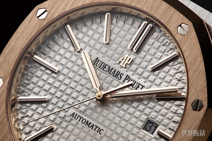 41mm跟它的前身39mm相比,除了尺寸上大了2mm、整体比例做了些微调之外,最显着的修改点就是AP Logo的位置,旧版的AP Logo直接顶到面盘边缘充当12点鐘时标,新版则是将它缩小、下移,恢復了12点的双槓时标;这个修改虽然细微,持平来说在审美上也谈不上孰优孰劣,但说穿了歷来皇家橡树的改款其实也就是把AP Logo搬来搬去,比较现行的两种基本款、歷代復刻版和初代皇家橡树可以发现面盘上的AP Logo、品牌全名和”AUTOMATIC”字样几种元素各有不同的排列组合,虽然美感上的差异不大,不过对表迷来说每种变化都自有其意义。