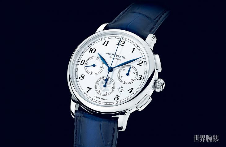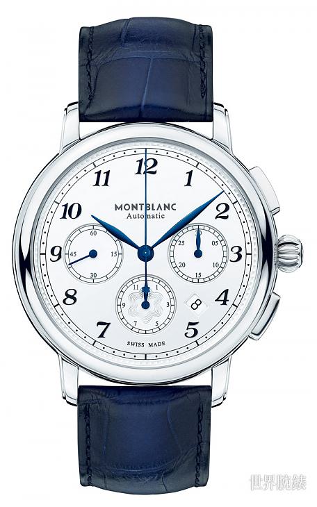 万宝龙Star Legacy系列计时自动腕表蕴含源于经典高级制表史的美学设计规范,并结合Minerva表厂在实用计时功能上的非凡传承。纯粹的银白色面盘在美学元素与计时功能之间达到完美的比例,经过重新设计的黑色阿拉伯数字、典雅的蓝色叶形指针、精致的阳刻浮雕扭索纹饰、以及环绕面盘与计时盘的独特轨道式分鐘刻度环,使得新款腕表在设计上更臻完美,并向Minerva表厂的优雅鐘表传承致以敬意。