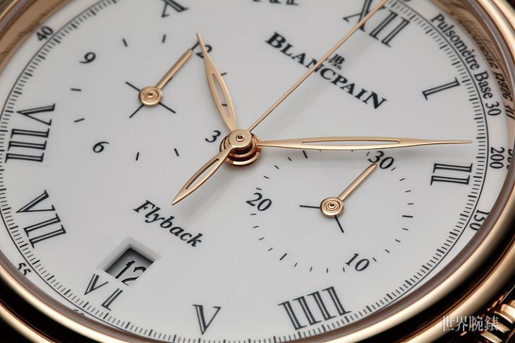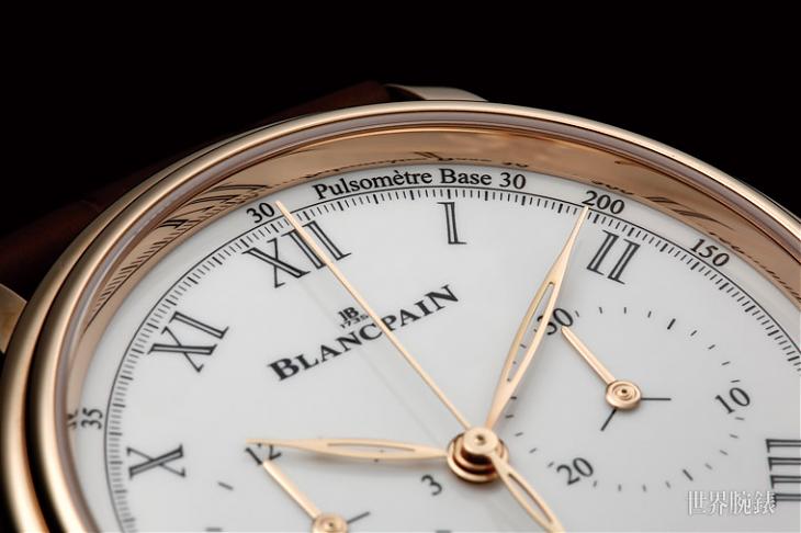 表款採用大明火珐琅面盘,这算是Villeret的绝活之一;面盘外缘标示的是脉搏计,这项测计实际用得上的机会不多,不过在那两年却似乎有愈来愈多的趋势,可见它对部分玩家来说还是有吸引力的。从脉搏计再往内一层是计时秒鐘的刻度,过去Villeret几乎没有画到这麼细的刻度过,这款会如此自然是因为是计时码表的关系,而配合机芯每秒来回10次震动,每格秒鐘裡的小刻度也是採用5分割(一般8震动的多是4分割),除此之外两个小计时盘刻度的标法和从中央拉出来的辐线也很别致。
