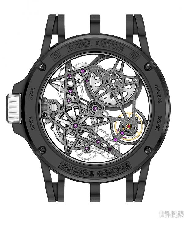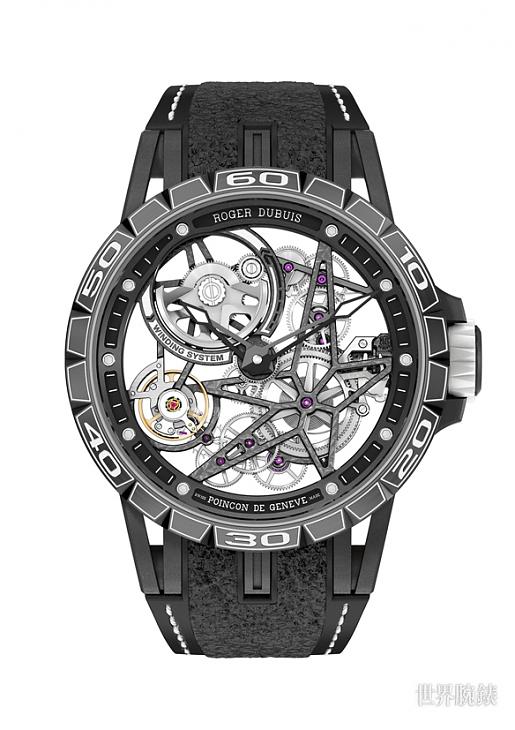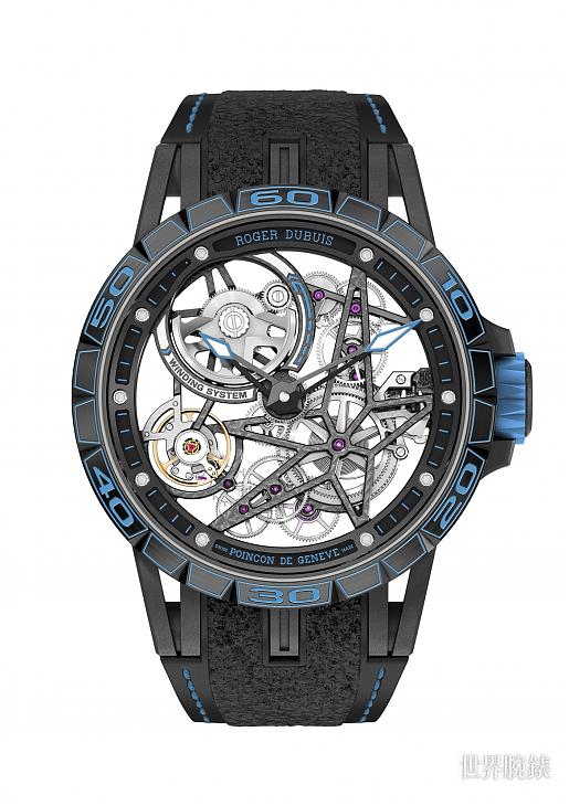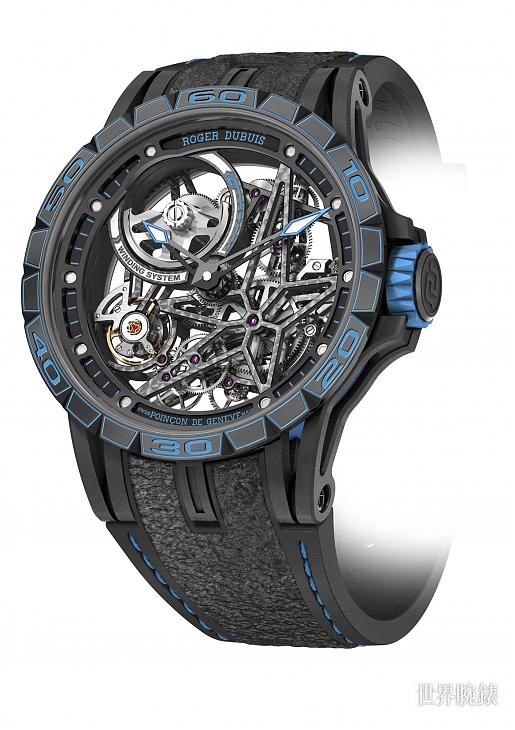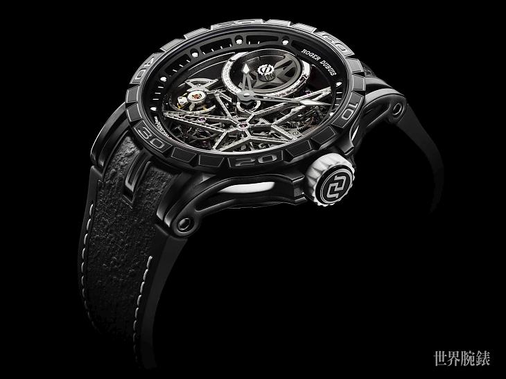 罗杰杜彼标誌的Excalibur Spider Pirelli系列推出全新Excalibur Spider Skeleton Automatic Pirelli自动鏤空表,以优雅明快的黑色鈦金属搭配任选的深蓝色或纯白色装饰元素,其所隐含的柏油路意象,暗示Pirelli倍耐力这个经典轮胎品牌展露锋芒的舞台。
