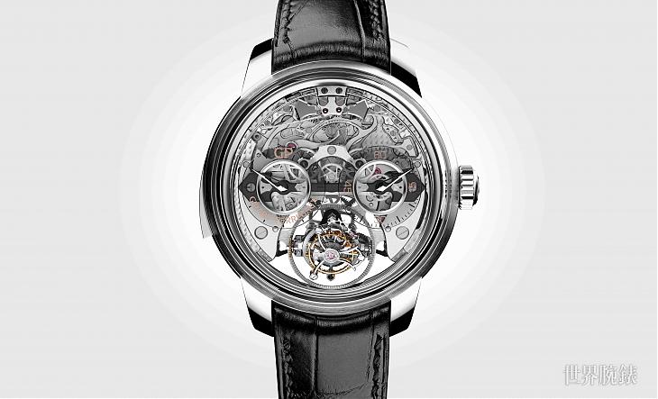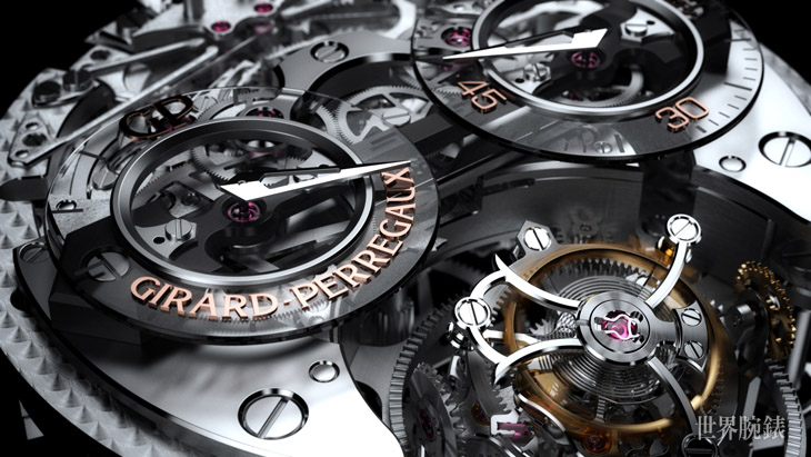 ▲GP芝柏表制表工坊的制表大师以一条长形表桥在上鍊表冠的位置,把面盘一分为二,以腾出充足的空间,在面盘的上半部位置,展示整个叁问报时的机械结构。