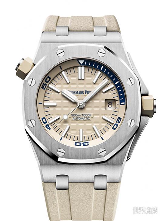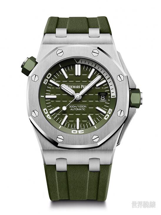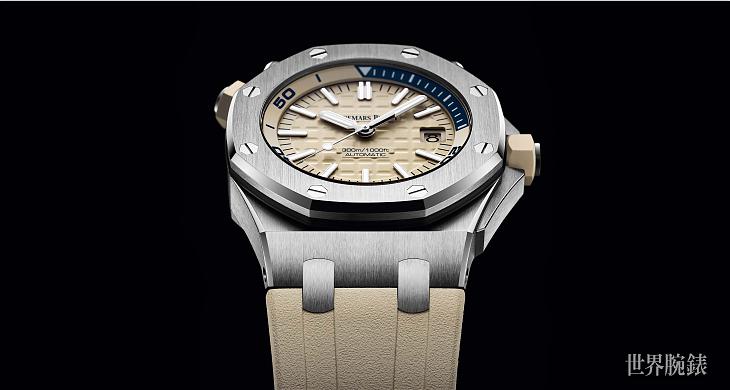 崭新的皇家橡树离岸型潜水表提供蓝绿色、米色、卡其绿色、紫色等面盘顏色,并配备与面盘色彩相应的橡胶表带。此系列腕表具有42毫米不锈钢表壳,搭配防眩光蓝宝石水晶镜面和底盖,以及与面盘同色的橡胶旋入式表冠。一如所有爱彼潜水表一般,这些顏色时髦活泼的表款也都具有300公尺深度的防水性能,并且配备一个可旋转的内环表圈,显示潜水专用刻度及从60到15分鐘的分段标示。