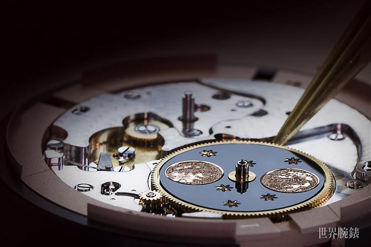 ▲縞玛瑙月相转盘上面镶有金质月亮以及星星图案,月亮表面更雕琢出仿真的凹凸地貌,让人看了爱不释手。