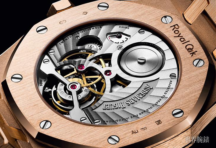 秉持1972年首款皇家橡树系列的优良特质,新款皇家橡树系列超薄陀飞轮腕表为不锈钢或玫瑰金或铂金材质,完美的表壳和表带一体化设计,41毫米表壳直径,防水深度为50米;标誌型的八角形表壳,搭配饰有变形版放射状的”Tapisserie”小格纹图案面盘,这是首度现身于叁款全新皇家橡树超薄陀飞轮腕表的新设计。6时位置可以看到陀飞轮框架,新款皇家橡树系列具有时分显示功能,为不影响面盘的简洁坚毅风格,动力储存显示设计在表底位置,透过透明蓝宝石水晶底盖,其五格动力显示清晰可见。