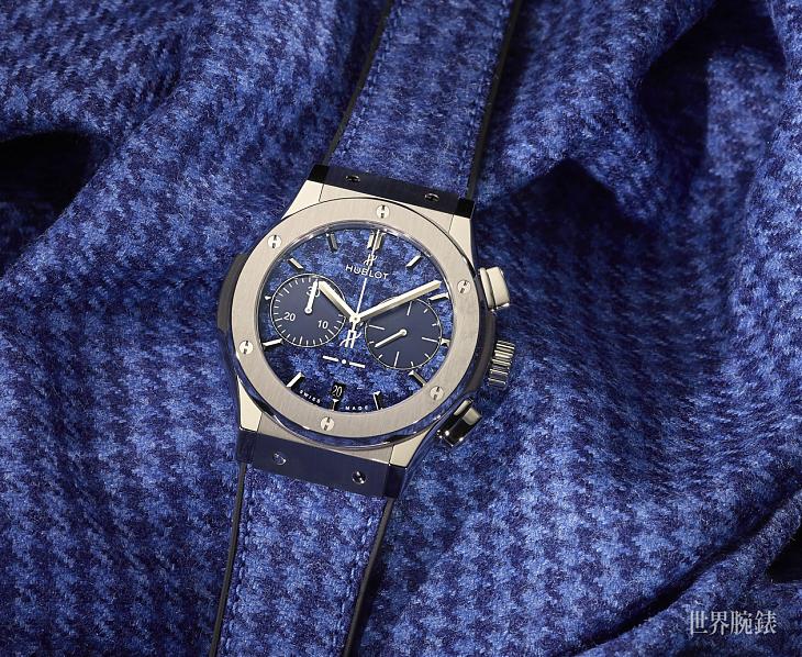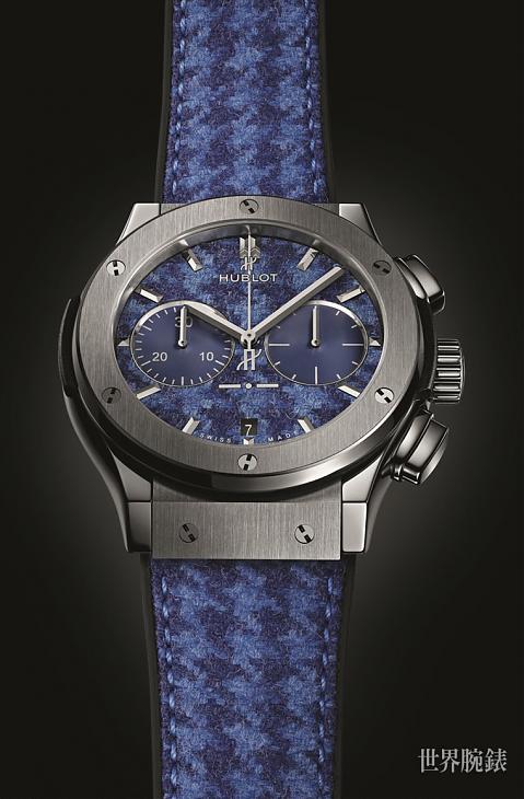 ▲ITALIA INDEPENDENT联名款推出最新版本,採用蓝色千鸟格纹西装面料做为主要特色,并结合宇舶主力计时机芯,释放出优雅的机械工艺魅力。