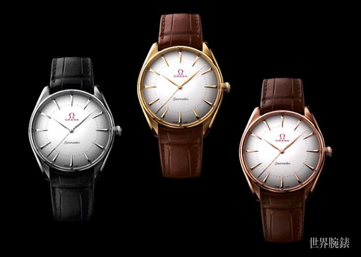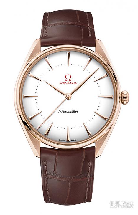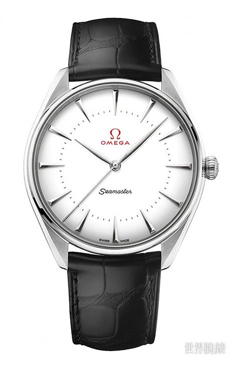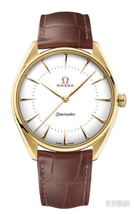 「柳叶形」指针及各款腕表的应用指标亦使用18K金制作,其蛋壳白圆形表盘十分轻盈,上面涂上瓷釉的欧米茄独特经典商标、分鐘刻度及海马字样。