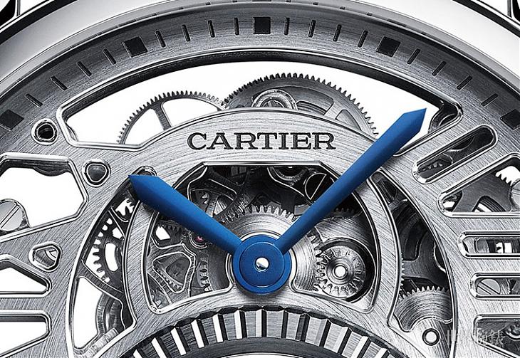 而佔据Rotonde de Cartier鏤空双重神祕陀飞轮腕表面盘大面积的双陀旋转陀飞轮以每六十秒鐘转动一圈,陀飞轮框架则以每五分鐘为一个周期进行第二重旋转。CARTIER将原先的罗马数字时标表桥特别加入鏤空设计,更显轻盈灵动、澎湃有力,为不影响腕表的阅时功能,Rotonde de Cartier鏤空双重神祕陀飞轮腕表蓝钢指针此时显得格外重要,同时蓝色的设计也呼应蓝气球表冠,达到视觉上的平衡美感。总的来说,Rotonde de Cartier鏤空双重神祕陀飞轮腕表浑圆流畅的腕表流露神祕气息,并结合了几何美感、造型设计与鏤空表桥。