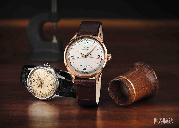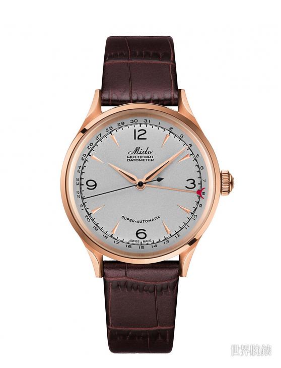 为庆祝品牌100週年的到来,MIDO将歷史中特别经典而独特的腕表作品于2018再现,将过往辉煌光荣时光再度传扬,而Multifort Datometer就是最真实的写照,沿袭该只古董表当时创造热销的美学设计细节,为了符合现代人的佩戴习惯微调加大表径至40毫米,玫瑰金PVD缎面丝光打磨处理不锈钢表壳,搭载特殊处理的盒式蓝宝石水晶玻璃镜面,可一览面盘完美传承自1939年出品的首批先锋系列的设计特点。银色磨砂面盘搭配黑色转印四方位的阿拉伯数字时标,在玫瑰金的映衬下,展现古董表纯熟的设计美感与精致度。运用具有悠久歷史的指针式日期显示是Multifort Datometer最引人注目的特点,5N玫瑰金处理中央日期指针以红漆点缀弯月形尖端,营造復古感十足的指示效果,PVD玫瑰金多角切面时标与钻石切割时分指针,几何呼应与细致打磨的倒角看出美度表对细节的重视,极纤细的秒针则以光泽黑色漆面处理,阿拉伯数字时标、时针和分针刻度上配有黑色Super-LumiNova®涂料,在黑暗中仍可确保走时的易读性。