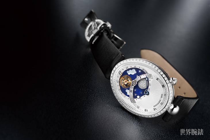 这款以青金石圆盘作为天空、白色珍珠母贝为云、手工鐫刻鈦金属金星和人脸月亮,但真正的主角为扮演太阳、本应藏于机芯内的黄铜色平衡摆轮,它被固定在组成时分盘的半月形钢质表桥上,靠轮框的琢面外缘,散发着犹如太阳般耀目的光芒。当平衡摆轮尽忠职守,太阳亦开展其24小时之旅,穿过支撑结构的钢桥下方,与针尖鏤空的宝璣蓝钢时针及分针相遇,与此同时,鈦质月亮亦到达了最高点,并与太阳相映成趣。如此新颖及细腻的日月轮转,不单为传统的24小时昼夜显示带来极具创意的表现手法,更显示了宝璣在每一款Reine de Naples腕表中对融合美学及机械技术的坚持。