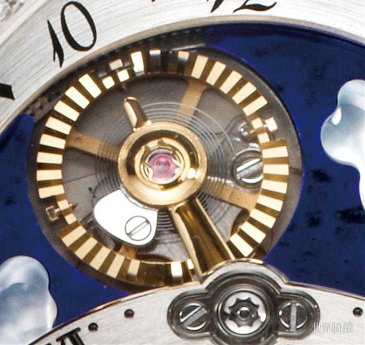 ▲太阳以半月形钢质表桥固定,随时间推移与相对的月亮交替旋转,以显示日夜;而以珍珠母贝及鈦金属所制的云朵和星星,其立体造型令此景象更为逼真。