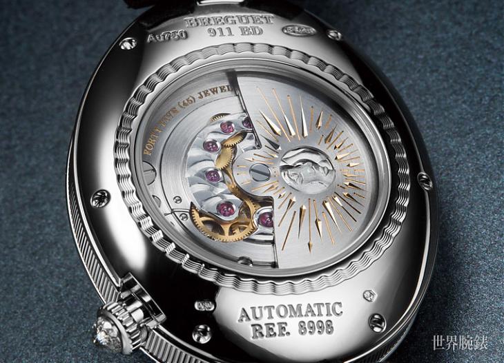 从装饰层面而言,不同的修饰方法亦让这款异想天开的复杂腕表更添美态,如以宝璣数字显示24小时昼夜显示,时圈则改以罗马数字显示;面盘下半部的火焰手工鐫刻图案,唤起了太阳的光辉,同时又与功能盘外缘的麦粒纹相对。而面盘内的凸缘及表框共镶嵌143颗钻石,约重1.45克拉,置于4点鐘位置的表冠则镶有一颗带叁角形琢面的梨形钻石,约重0.26克拉。翻至表背,鐫刻太阳光线的局部鏤空自动盘随即映入眼帘,并可透过蓝宝石水晶底盖欣赏精美的机芯,见证Reine de Naples系列一贯内外兼备的完美风貌。