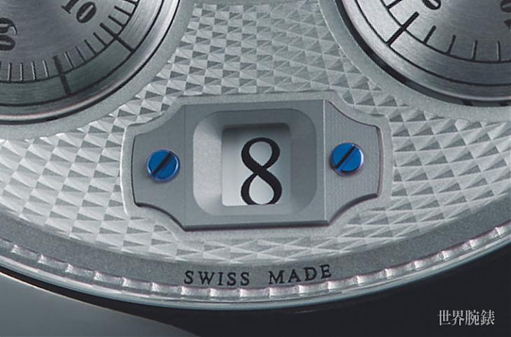 ▲表款的日期显示位于面盘的6点鐘方向,并在日期视窗两旁以蓝钢螺丝固定,增加了视觉上的精致感。