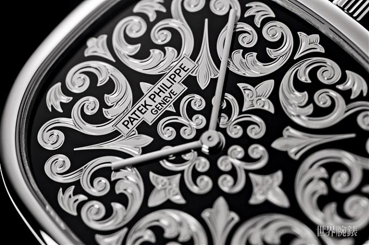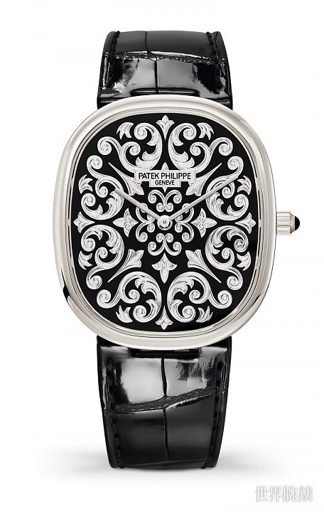 Ref. 5738/50P-001腕表表面黑色珐琅底层犹如背景,映衬18K白金底板上的人手精雕螺旋图案。表面中央由雕刻大师勾勒多时,带来如此精致的装饰成果。表面与Golden Ellipse鲜明俐落的线条融和无间,突显黄金比例营造的和谐感觉。精巧白金髮状指针经磨拭加工,追踪时分流逝。