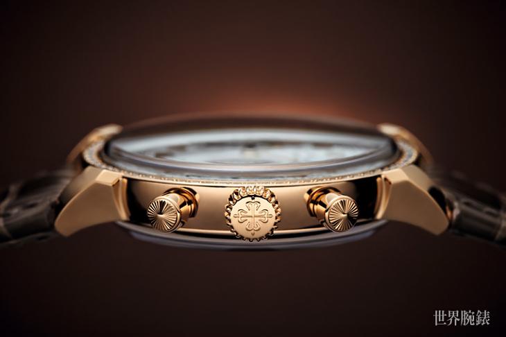 ▲表冠可见卡勒卓华十字、计时码表按把也拥有手工雕刻的放射状饰纹,使表款看起来更赏心悦目。