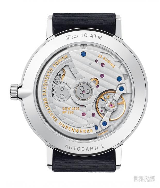 不锈钢材质/DUW 6101自动上鍊机芯/时、分、小秒、日期显示/蓝宝石水晶镜面、透明底盖/防水100米/表径41mm