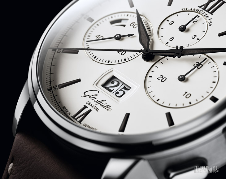 面盘由制表厂在佛茨海姆Pforzheim的专业技师手工制作,採用当代设计语汇,为品味高雅、风格随性自然的男士而设计。30分鐘和12小时计时盘与小秒盘巧妙对应,重现Senator系列特有的对称性。三个计时盘在小秒盘内的动力储存显示衬托下更显和谐一体。GLASHÜTTE ORIGINAL经典的大日期座落在计时器和小秒盘组成的三角形下方,显得明快又清晰可辨。大日期的两个数字盘安装在同一个平面上,没有中央分隔线干扰,使日期显示更平顺和令人印象深刻。