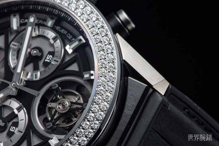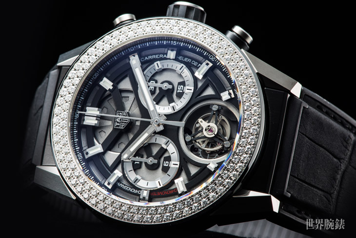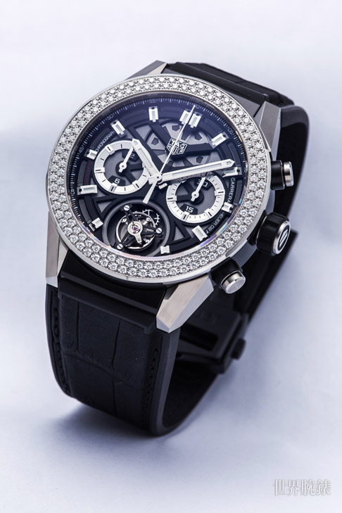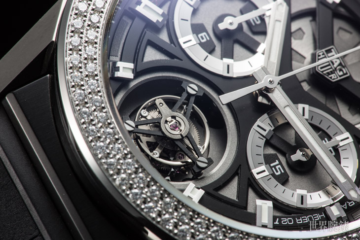 不锈钢、鈦金属材质/Heuer 02自动上鍊机芯/时、分显示/陀飞轮装置/计时码表功能/表圈镶钻128颗,约重1.37克拉/蓝宝石水晶镜面/防水100米/表径45mm/参考价:NT$ 780,100