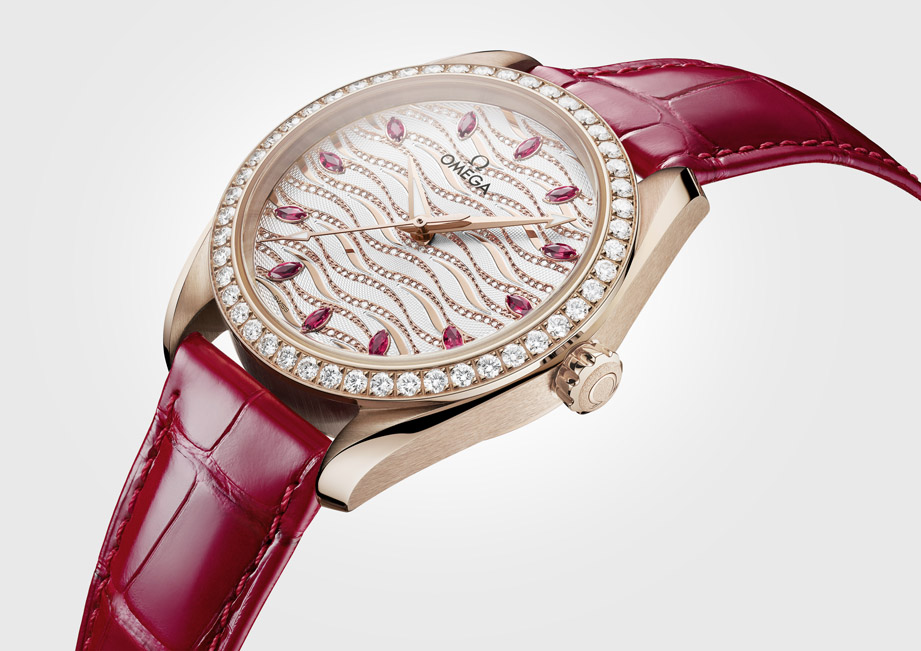 全新海马Aqua Terra珠宝腕表採用以18K Sedna™金铸造的38mm对称表壳及指针,并缀饰镶钻表圈,而12 个小时刻度上则各镶饰一颗欖尖形切割红宝石。表面设计精致优雅,採用银色、18K Sedna™金和铺镶191颗钻石的18K Sedna™金波纹制作,拼凑出互相交织的扭索状波浪图案,活现海洋此起彼落的韵律。