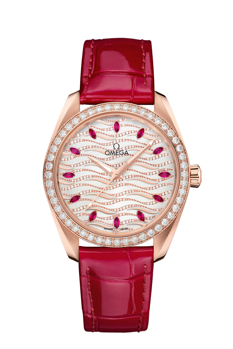 表壳的侧面设有Aqua Terra 系列的圆锥形表冠,上面缀有光面欧米茄标志。腕表配衬亮丽的红色皮革表带,内置8807 Co-Axial Master Chronometer 机芯,精准度、性能及抗磁功能均经过严格测试,达到业界最高的认证标准。