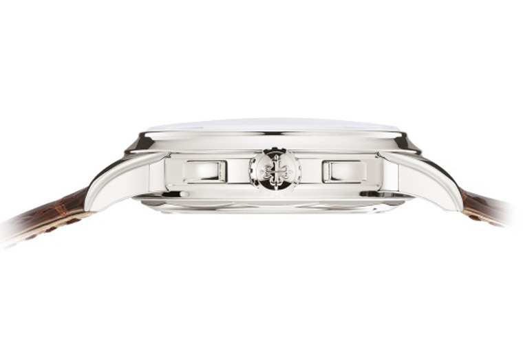 表款搭载的CH 29-535 PS Q手动上链机芯秉持表王一贯的制作风范,不仅拥有百达翡丽印记,各机芯零件的修饰处理都是百年制表工艺的呈现,可透过透明底盖恣意鑑赏外。CH 29-535 PS Q计时机芯蕴含不少革新特点,如驱动、离合器和计时码表等齿轮弃用常规的的三角轮齿,转而採纳全新的专利轮齿形状来减少耗损、提升效率;又如起用形状略不规则的导柱轮帽盖,其最远点能十分准确地识别离合槓桿的位置等,让腕表运作倍加顺畅。而品牌亦用上两年时间将厚度1.65毫米的传统凸轮操控日期装置,与由182枚部件组成的计时码表模组磨合,直到机芯结构展现出令人满意的运作流畅度与稳定性为止。