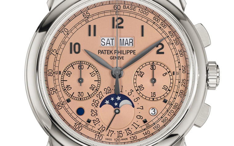 自1941年的第一代万年历计时码表Ref. 1518面世,及至后继的Ref. 2499、Ref. 3970及Ref. 5970,精细的做工、典雅的气派与热烈的市场反应造就了这一标志性作品。至于Ref. 5270自2011年推出白金版后,也有白面(Ref. 5270G-018)或蓝面 (Ref.5270G-019)变化,而2015年推出的Ref. 5270R则首次以玫瑰金表壳呈现。来到2018年又加入了铂金版本(表壳六点方向的钻石可供区辨),表款面盘的整体布局维持不变,下三眼配置为3点的30分钟计时盘、6点的月相连指针式日期及9点的小秒盘,中轴上方并列的星期与日期显示,月相盘左右两旁的日夜与闰年视窗,面盘外缘则有轨道式分钟刻度与测速计刻度,资讯繁复但是安排的倒算井然有序。
