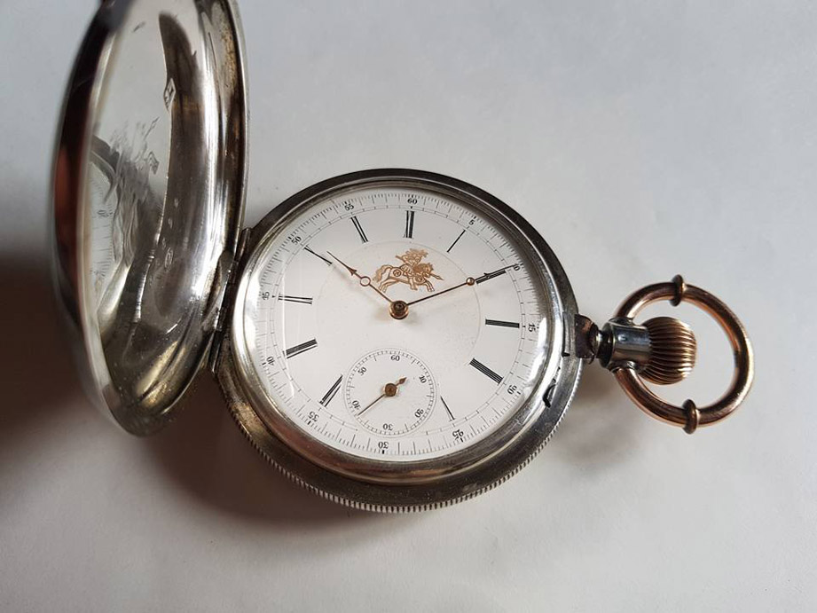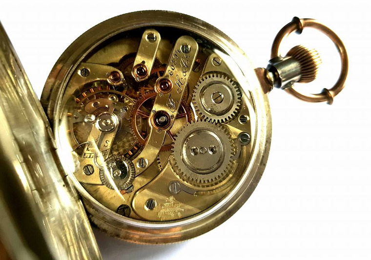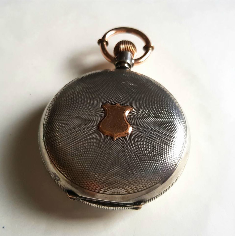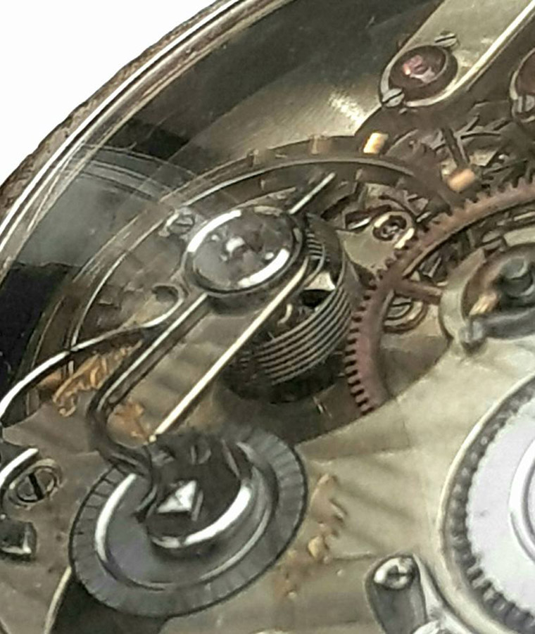 在20世纪前后,瑞士也有怀表出口到日本,当年SEIKO刚创业,在钟表的制作上还没能赶上瑞士。而当年外销到日本的怀表等级算挺高级。上图这只面盘有铁甲武士骑战马图案的怀表,就是当时销日本的作品。尺寸近60mm,发条盒内有防绞断的五角齿轮装置(俗称马尔他十字)。涡轮式微调机制,合金双层游丝(早期比较高级有自动补偿作用),螺丝平衡摆轮等,属于高级机种。