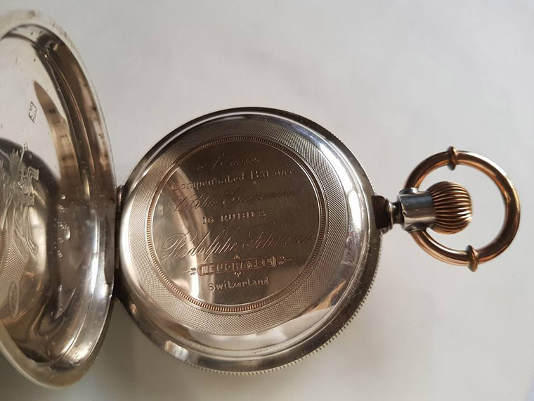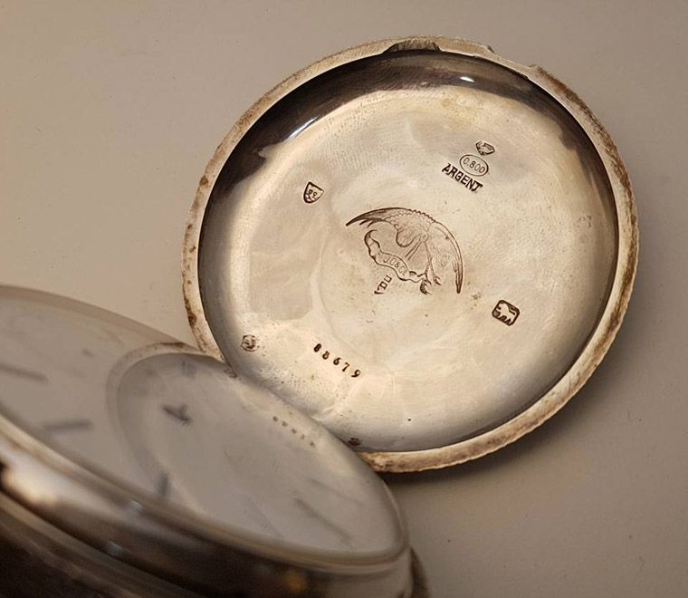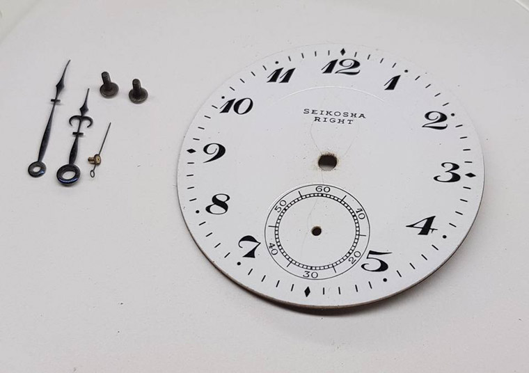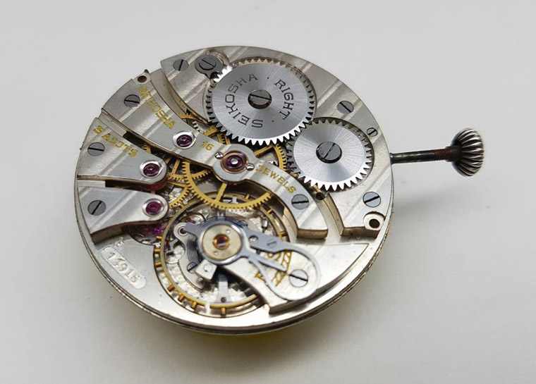 图中另一只表壳内有鹤图案的怀表,也是销日本市场,搭载的是筒状游丝,非常罕见,皆为银壳。另外一个怀表机芯虽然在大钢轮上打了”Seikosha”,也是瑞士机芯,属高档次。