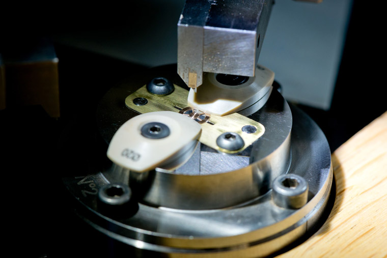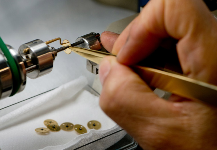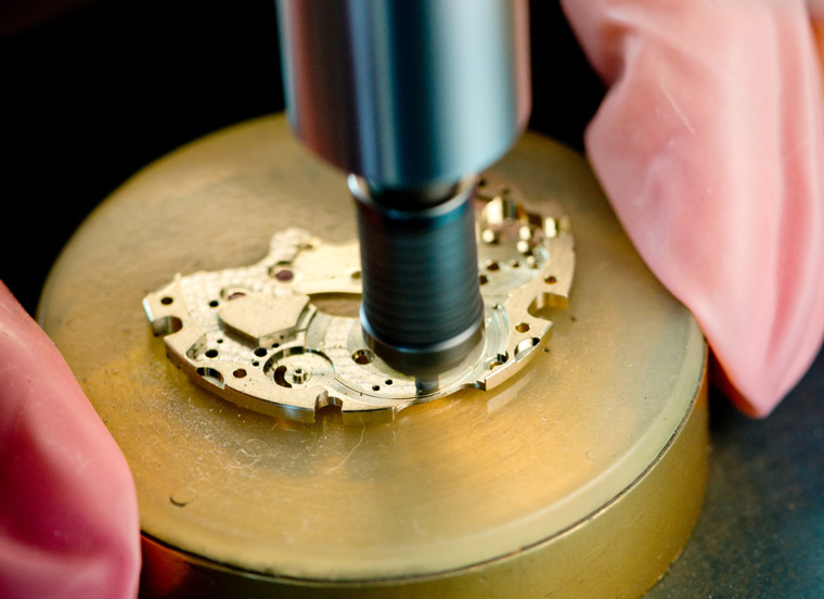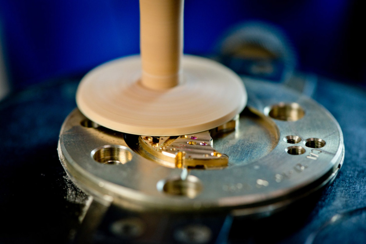 过去,由于润滑油流动不太稳定,开挖齿轮槽是为了让润滑油尽可能聚集在中轴。今天,这道工序仅是为了美观,既能突出细节,又能提升一只超卓时计的整体品质。不同齿轮(扁平的金属圆盘)都会有一个拋光挖槽,即一个凹面倒角或略微凹陷的空槽。这道工序使用一台装有钻石切割工具的机镂车床完成,将钻石刀具小心调低并在部件上方固定好,挖出牛眼般的圆形图案或双圆形图案。如此逐一完成各个耀眼的完美圆圈凹槽。