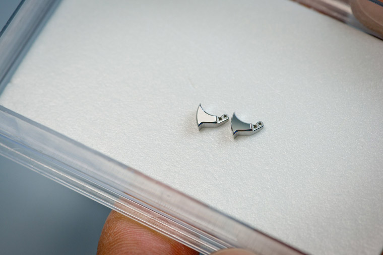 百达翡丽精饰小齿轮所需65个步骤的最后工序。小齿轮由一个齿轮轴和附近称为「齿瓣」的长形轮齿组成,为传动装置提供动力。因为轴端面积极小,基本上不可能在齿轮轴的末端(即枢轴端)进行任何加工;但若将小齿轮放入一个齿轮盘内(一般可同时拋光多个轴端),仅露出轴尖,便可进行加工。利用车床磨砂轮进行拋光时,操作人员会使用放大镜检查,直到枢轴这些末端的光滑和外凸程度令人满意。
