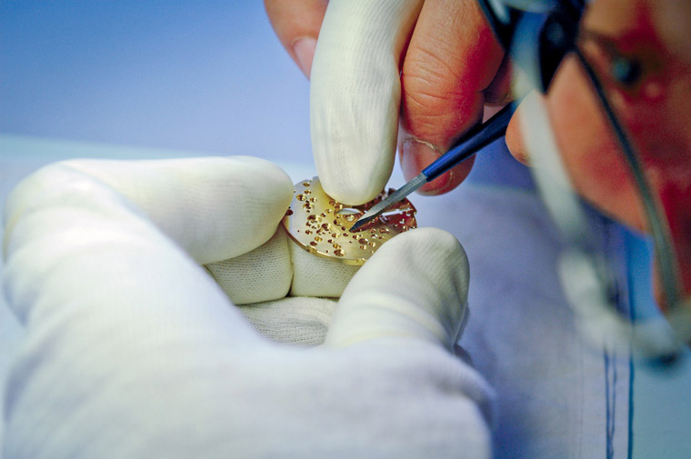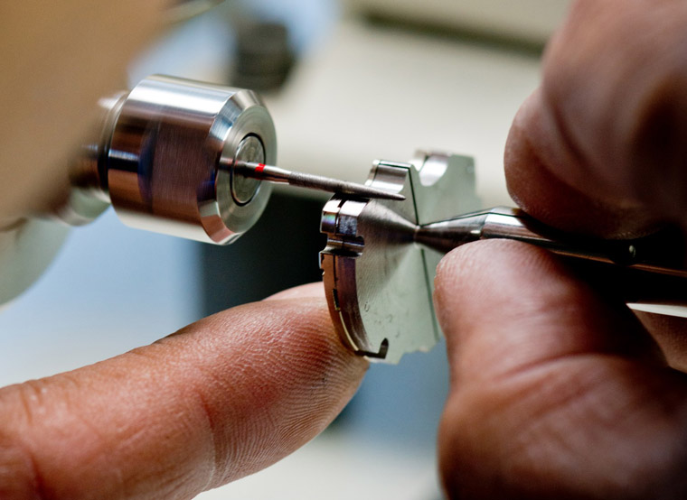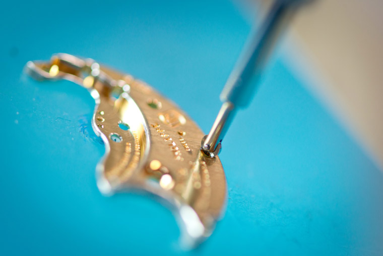 这项操作步骤充满想像力,却有一个直接了当的名字。使用在轻质汽油中浸泡过的珠宝加工工具,在先前由机器钻出的小孔上旋转挖出倒角凹面——亦称为凹槽。为了装配螺丝或镶嵌宝石,接着要将凹槽高度拋光。