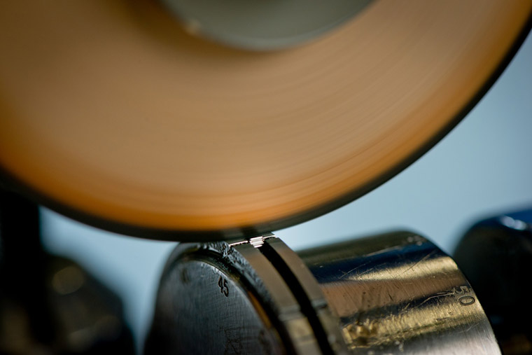 这是在钢制小齿轮(和其他一些钢制齿轮)上进行的另一项操作,旨在尽可能减少齿轮组的任何摩擦、磨损,确保具有更长的使用寿命和质量。同样,小齿轮的微小尺寸令这个任务极其困难。首先,操作人员要将极小的齿轮放在一个承托座上,涂上薄薄一层蓝色研磨膏,确定其能够自由转动。然后,由专门工匠在木制磨砂轮上另涂一层研磨膏,最后在把木盘调低至接触到轮齿,令小齿轮像在时计中那样转动,从而把轮齿打磨至银光闪亮。