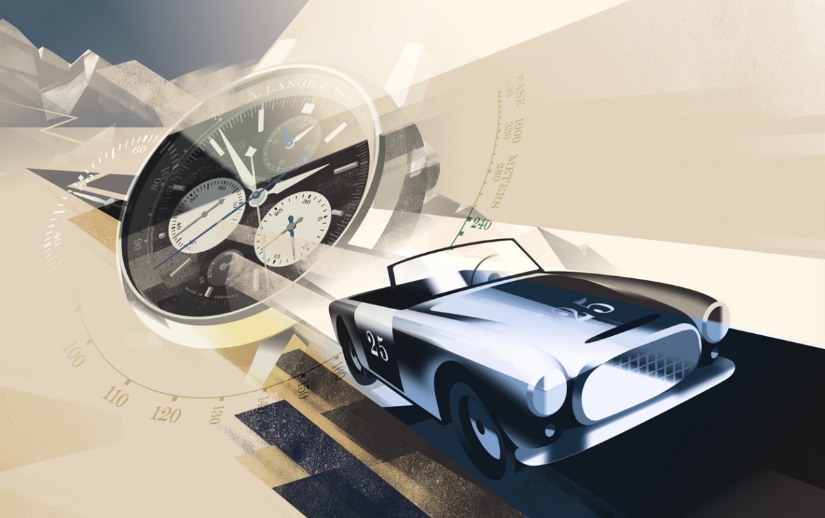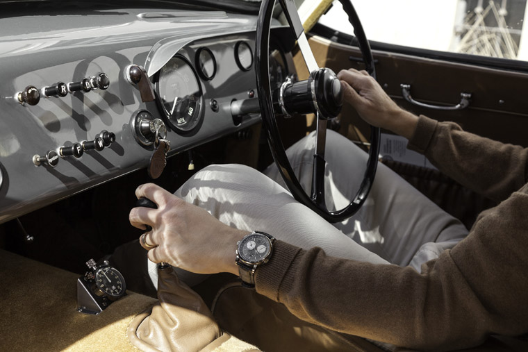 ▲Wilhelm Schmid佩戴Triple Split腕表驾驶Le Mans古董车,表款的灰色面盘刚好与跑车的灰色仪表板互相辉映。
