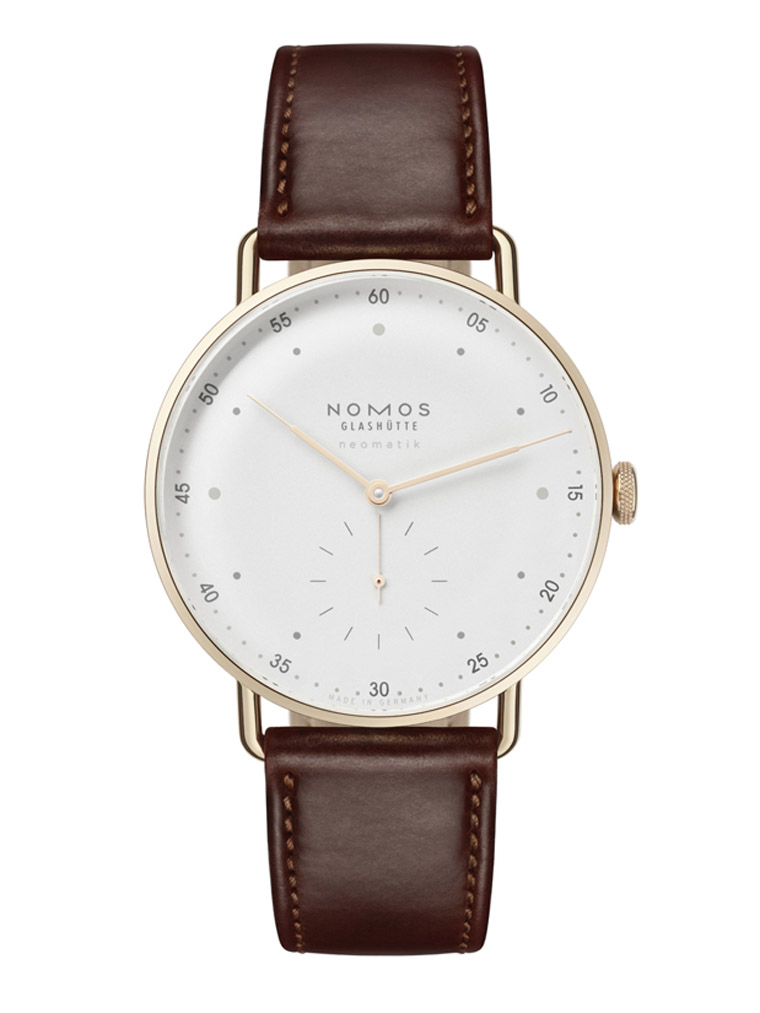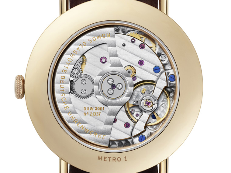 NOMOS畅销表款Metro首次以18K金制作表壳,搭载NOMOS自制机芯DUW 3001。这枚机芯令腕表显得精美纤薄,并确保稳健的走时精度,同时它的设计感也相当强烈,彰显出时尚典雅的大气风范。