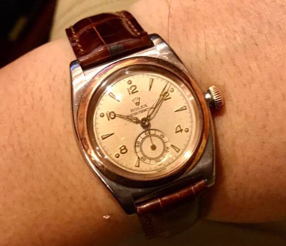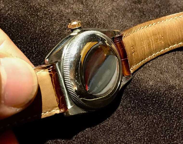 此腕表是约1935年左右的古董表,是老劳经典代表作,「泡泡背」是全世界第一只自动盘能360度旋转上链的腕表,由于厚重自动盘的关系,后底盖如同泡泡般的凸起,故称为泡泡背。由外型我们可以发觉到「经典劳力士」的设计。在早期一开始便是如此的风格,肉眼看起来和现在的劳力士,其味道和风格依然传承经典,若这不是经典,什麼才是经典呢?