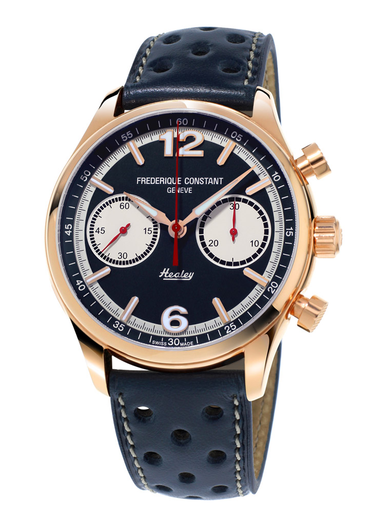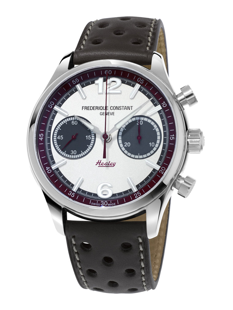 FREDERIQUE CONSTANT此次推出全新限量版Vintage Rally计时码表,向AUSTIN HEALEY车厂致意,三款全新腕表继承1960年代英国汽车的经典设计,向其致意。腕表採用42毫米直径不锈钢款或玫瑰包金款,尺寸大气,读时便利。不锈钢材质造就理想的重量和韧度。覆盖面盘的凸面蓝宝石水晶能抵抗衝击和刮花,是应付赛车考验的理想材质。其防水深度为5米,适合于户外佩戴。