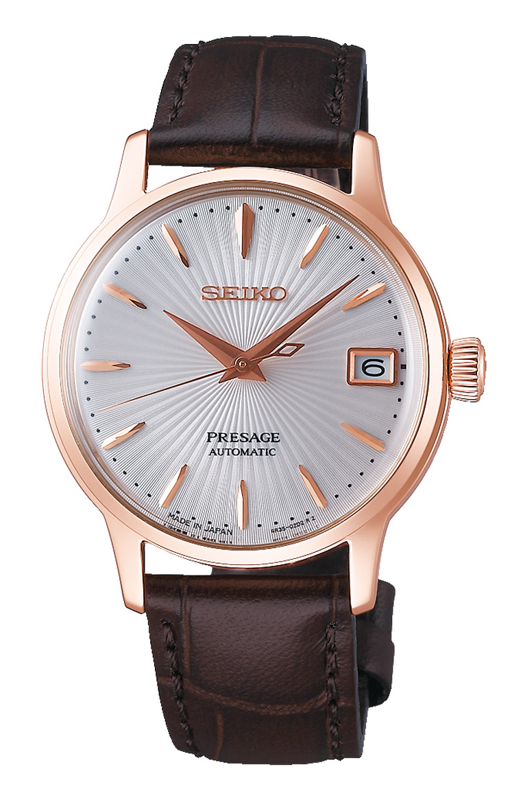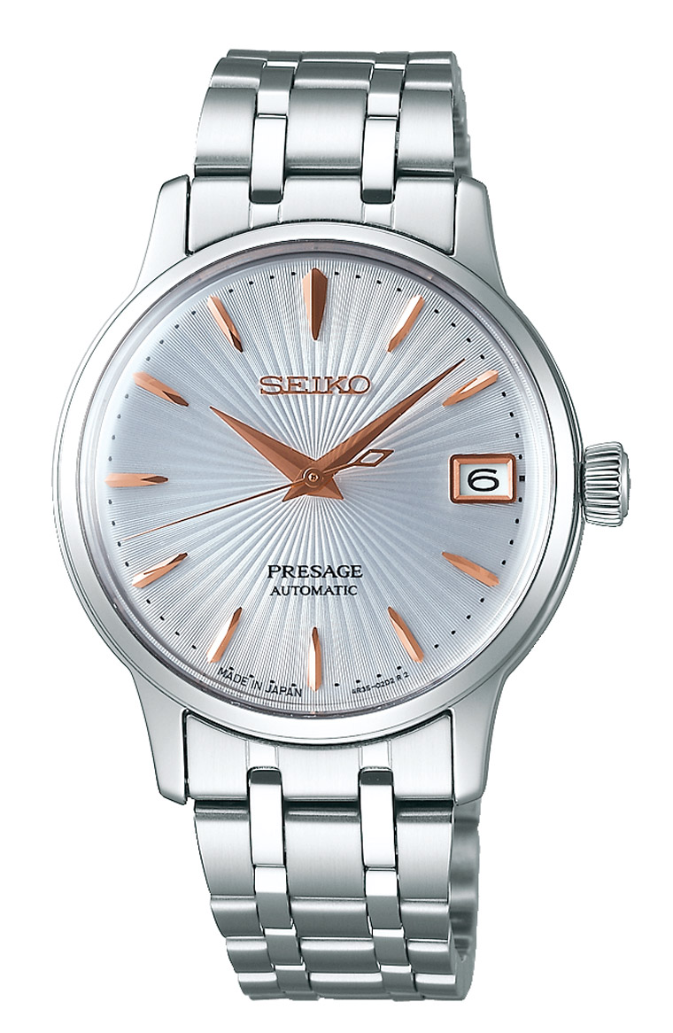 Presage表款”SRP855J1”设计灵感源自「Spritzer气泡酒」,悠悠上升的银白色Spritzer酒体在面盘中心发散荡漾,简约优雅的玫瑰金指针、时标刻度的点缀带来Spritzer啵啵作响的惊喜口感,不锈钢链带的清爽配色设计与面盘配色完美调和,让Spritzer恰如其分的繽纷感在都会女子淡雅又洗链的知性气质腕上跃然呈现。