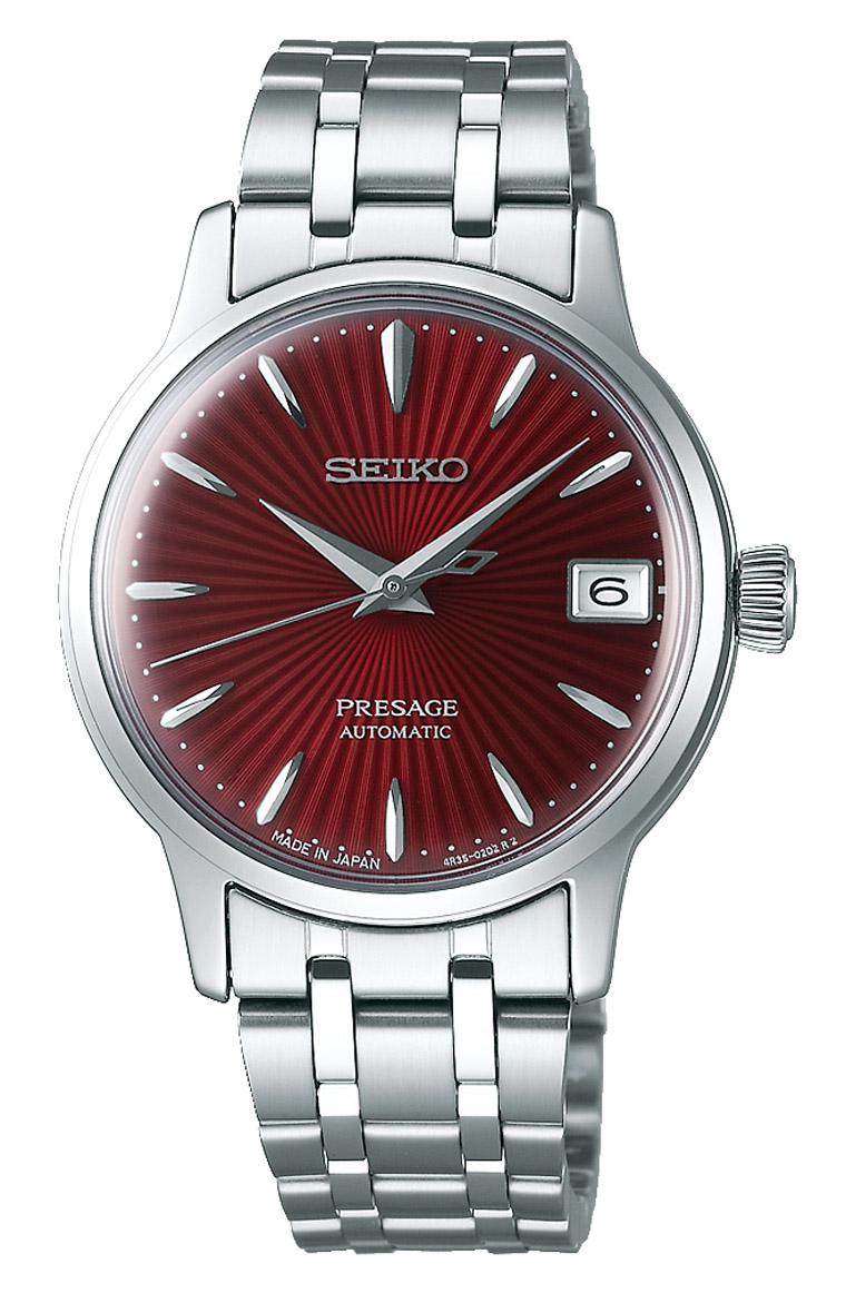 「Kir Royale皇家基尔」红色透明色泽的诞生,来自香檳与黑醋栗香甜酒的打破调酒规则的创意混搭,此即Presage表款”SRP853J1”的设计灵感来源。浓冽中略带透明感的酒红色面盘,犹如散发浓烈果香的黑醋栗甜酒,不锈钢链带搭配则成滑顺闪烁的香檳口感,如同「Kir Royale皇家基尔」在馥郁醇厚及淡雅香气中取得微妙平衡,醉人酒香瞬间化为腕上华美方寸。